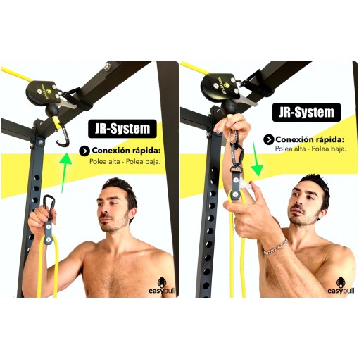 Intègre 4 JR-System: Un système avec bloqueur qui vous permet de régler très rapidement la longueur de la corde et vous pourrez passer de la poulie haute à la poulie basse en moins de 10 secondes. REGARDER LA VIDÉO.