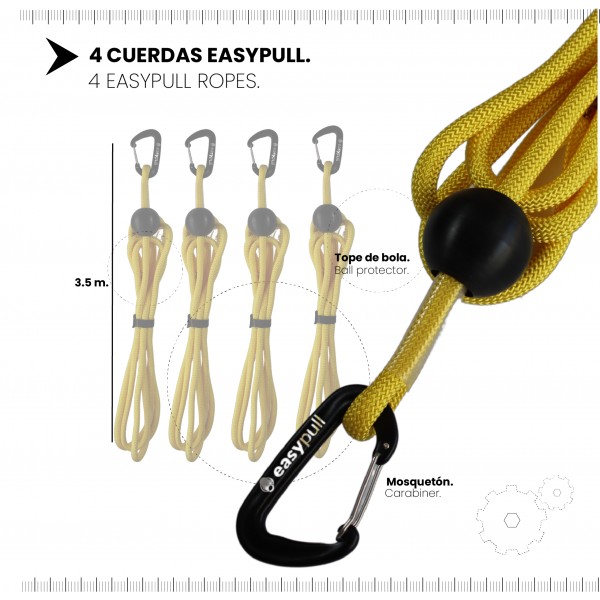 ▶️4 cordes jaunes de 3,5 m avec butée à billes et mousqueton noir easypull.